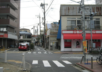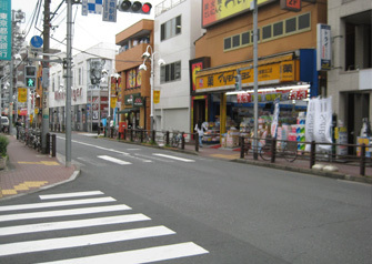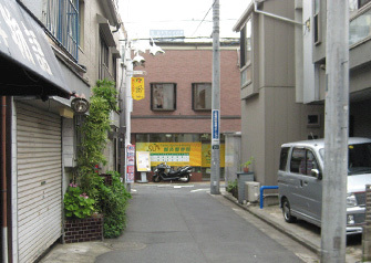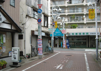 上板橋駅前の信号をマツモトキヨシのほうへ渡り左へ進みます。すぐ、モスバーガーがございます。モスバーガーの角を右へ曲がります。